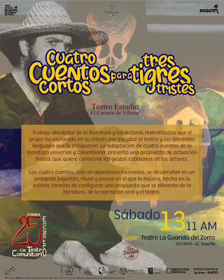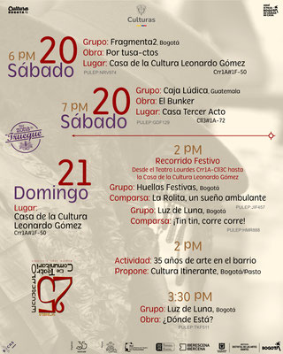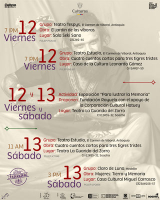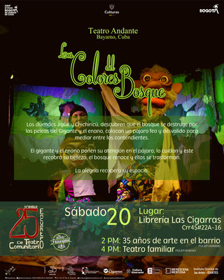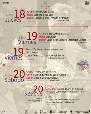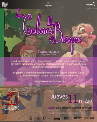 Nuestros aliados: Casa de la Cultura Leonardo Gómez, Corporación Colombiana de Teatro, Teatro Experimental Fontibón, Casa Cultural Miguel Carrasco, Libros Buenos a la Vereda, Liceo Infantil Trencito de Papel, La Guarida del Zorro, Circomunidad, Biblored - Biblioteca Cárcel Distrital, Tercer Acto, Teatro Independiente, Librería Las Cigarras, Corporación Araneus, Cultura Itinerante, Corporación Hatuey, JAC Atanasio Girardot y la Red Colombiana de Teatro en Comunidad.