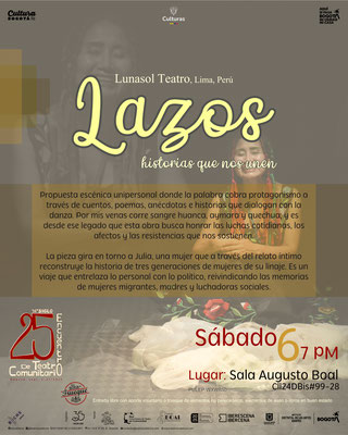 Con el apoyo de la beca de Espacios Vivos y la beca de Producción de Festivales Teatrales, ofertadas por el Ministerio de las Culturas, las Artes y los Saberes, y la Beca LEP de Festivales Independientes de Teatro y Circo de Bogotá, del Programa Distrital de Estímulos 2025, se complementa una oferta teatral con grupos provenientes de Antioquia, Cundinamarca y Bogotá.