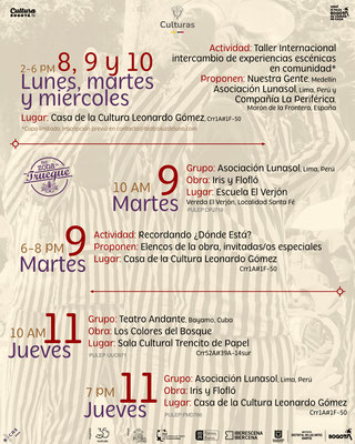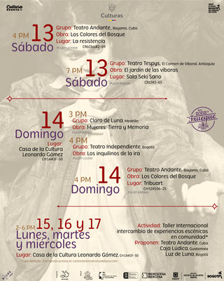 Son 30 funciones en 15 escenarios, 17 grupos, más de 130 artistas en escena, equipos técnicos y de producción dispuestos para 17 días de actividades, la entrada a las obras es a través de la Zona de Trueque, allí se recibirán aportes voluntarios, elementos de aseo, libros y alimentos no perecederos.